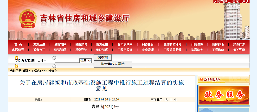 3月16日,吉林省住建廳發布《關于在房屋建筑和市政基礎設施工程中推行施工過程結算的實施意見》。施工合同工期一年(含一年)以上的房屋建筑和市政基礎設施工程,推行施工過程結算。鼓勵施工過程結算實行全過程造價咨詢服務: