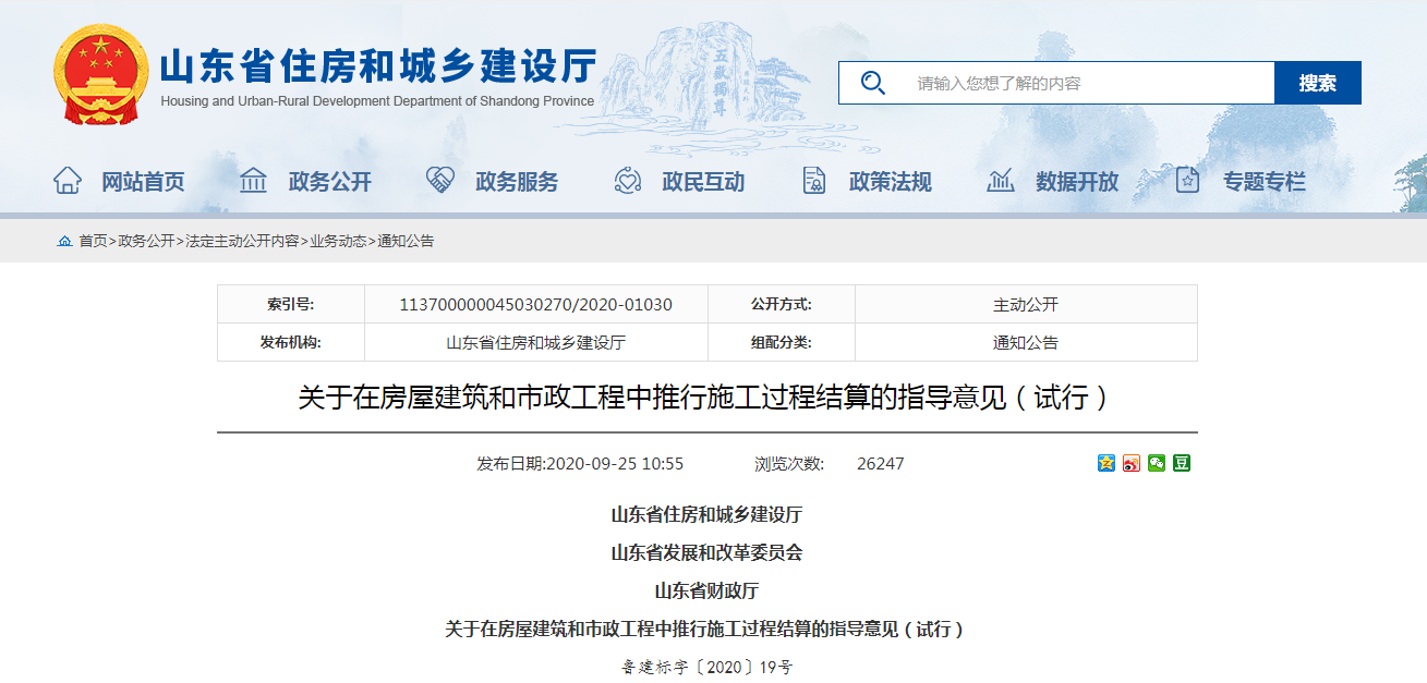 2020年9月17日,山東省住房城鄉建設廳、省發展改革委、省財政廳三部門聯合印發《關于在房屋建筑和市政工程中推行施工過程結算的指導意見(試行)》,通過規范結算行為,縮短結算周期,減輕企業負擔: