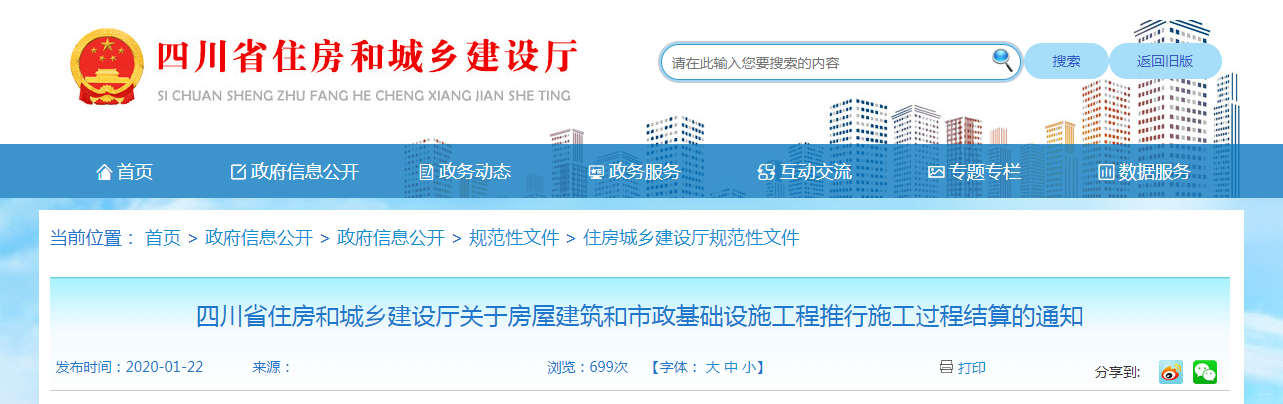 2020年1月22日,四川發文,全省房屋建筑和市政基礎設施工程施工合同工期兩年以上的新開工項目要積極推行施工過程結算。從2020年3月1日起執行,有效期5年。