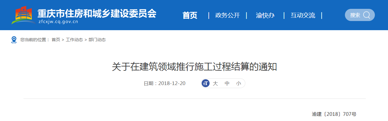 2018年12月20日,重慶市住建委發布《關于在建筑領域推行施工過程結算的通知》,要求:新開工、建設工期兩年以上工程,推行施工過程結算。