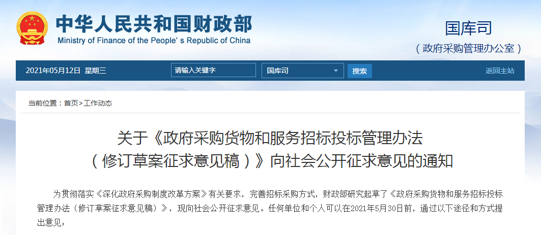 為貫徹落實(shí)《深化政府采購(gòu)制度改革方案》有關(guān)要求,完善招標(biāo)采購(gòu)方式,財(cái)政部研究起草了《政府采購(gòu)貨物和服務(wù)招標(biāo)投標(biāo)管理辦法(修訂草案征求意見稿)》,現(xiàn)向社會(huì)公開征求意見。任何單位和個(gè)人可以在2021年5月30日前,通過以下途徑和方式提出意見: