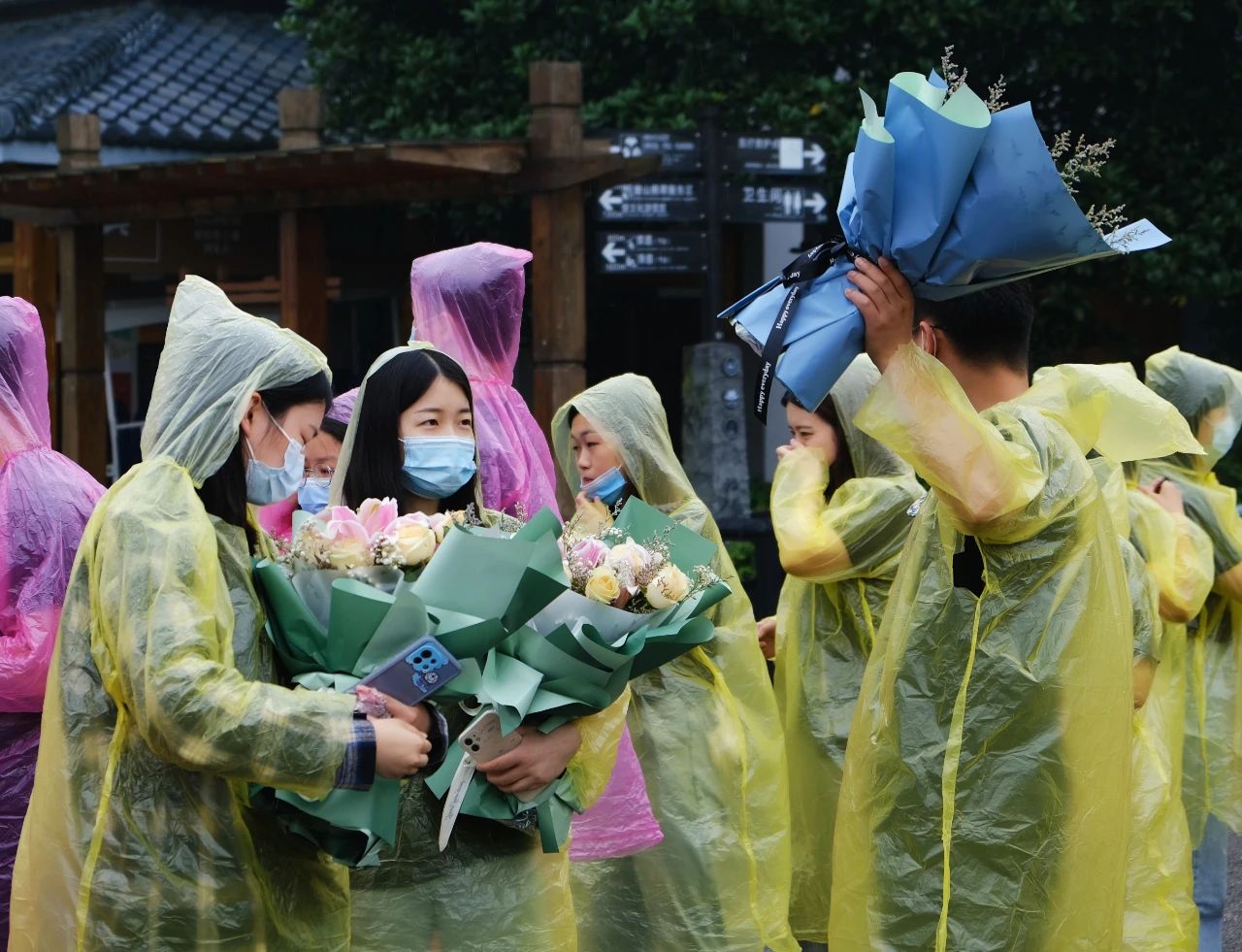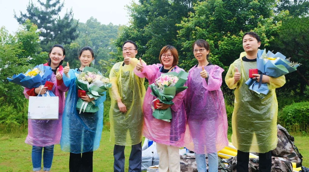 活動當天雖當天上午持續陰雨連綿,但是出游的同事們并未停下腳步,路途大巴上交談甚歡載歌載舞,欣喜之情溢于言表,穿上花花綠綠的雨衣在雨霧中穿行,在東湖磨山水墨畫一般的景色中劃出一條彩色的長線,亦是一道別樣的風景。