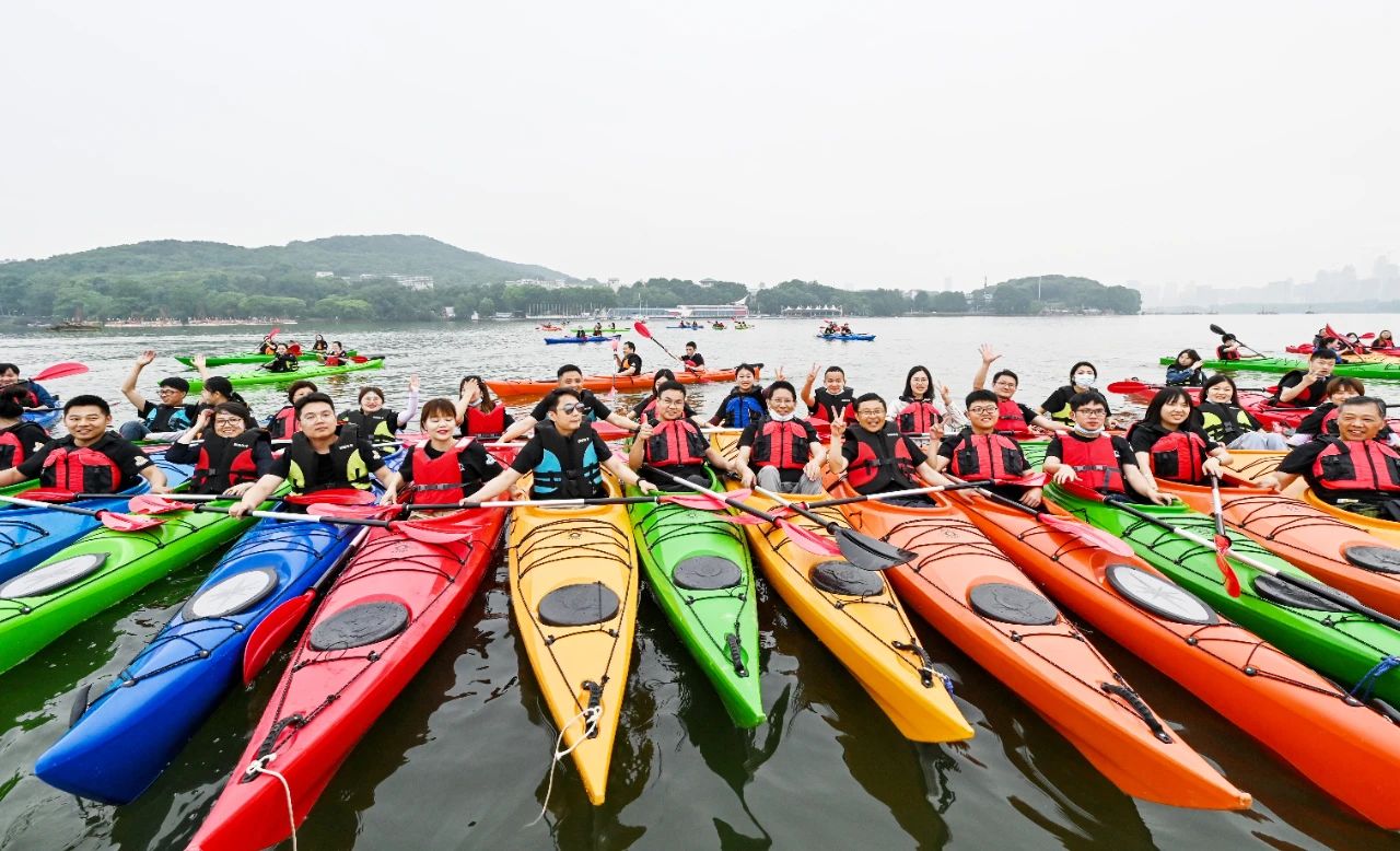 接下來是皮劃艇環節,五顏六色的皮劃艇整齊的排列在地上,小伙伴們早已迫不及待的穿上了救生衣,拿起了船槳,整齊的方陣蠢蠢欲動,頗有“百萬雄師過大江”的氣勢。