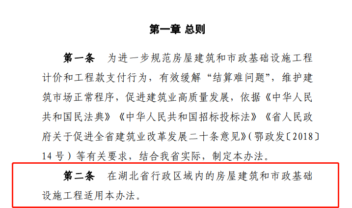 自本辦法實(shí)施之日起,湖北省內(nèi)的房屋建筑和市政基礎(chǔ)設(shè)施工程適用本辦法,不區(qū)分資金性質(zhì)。施工工程是否必須適用本《暫行辦法》,則需結(jié)合項(xiàng)目進(jìn)展情況而定:已進(jìn)行招投標(biāo)或已簽訂合同的工程,仍按原約定執(zhí)行,已發(fā)包暫未確定中標(biāo)單位的,招標(biāo)人可發(fā)布澄清公告對結(jié)算方式進(jìn)行變更,也可以按原約定繼續(xù)進(jìn)行。