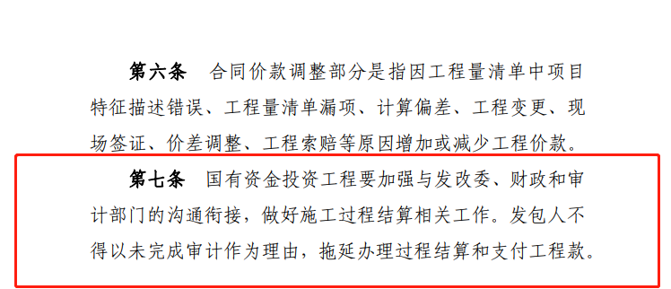 推行過程結(jié)算,建設(shè)單位應(yīng)滿足施工所需的資金安排,工程驗(yàn)收通過時原則上應(yīng)同步完成工程款結(jié)算,不得變相拖延結(jié)算。國有資金投資工程應(yīng)當(dāng)按照國家有關(guān)規(guī)定確保資金按時支付到位,不得以未完成審計作為延期工程款結(jié)算的理由。在以往的建設(shè)工程司法案例中,合同雙方若在合同中約定以行政審計后的價款作為結(jié)算價款的,法院予以支持。眾所周知,行政審計一般在項(xiàng)目驗(yàn)收完成之后進(jìn)行,那么在推行施工過程結(jié)算的背景下,發(fā)包人在招標(biāo)文件及合同條款中再約定以行政審計后的價款作為結(jié)算依據(jù)的,明顯與過程結(jié)算的推行意義相違背。