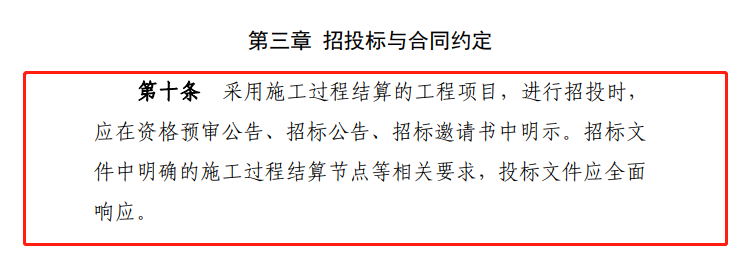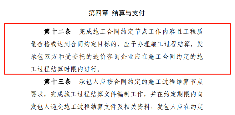 本條定義何為施工過程結(jié)算,相較住建部2021年發(fā)布的《建筑工程施工發(fā)包與承包計價管理辦法》(修訂征求意見稿)第十九條規(guī)定“全面推行施工過程結(jié)算和支付。發(fā)承包雙方通過合同約定,按時間節(jié)點(diǎn)或進(jìn)度節(jié)點(diǎn)對周期內(nèi)已完成且無爭議的工程量進(jìn)行價款計算、確認(rèn),并按照合同約定比例支付。”《暫行辦法》增加了節(jié)點(diǎn)驗(yàn)收,驗(yàn)收是節(jié)點(diǎn)結(jié)算與支付的前提。
