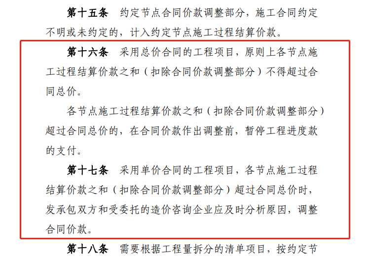 分別對總價合同的建設(shè)項(xiàng)目和單價合同的建設(shè)項(xiàng)目的施工過程結(jié)算的方式和過程進(jìn)行解釋、說明。總而言之,不管總價合同還是單價合同,施工過程結(jié)算價款之和(扣除合同價款調(diào)整部分)均不得超過合同總價,否則可能出現(xiàn)工程未完成已支付完成的情況。具體支付比例可根據(jù)發(fā)包人資金使用計劃在合同中約定,但不得低于當(dāng)?shù)匦姓鞴懿块T的相關(guān)規(guī)定。