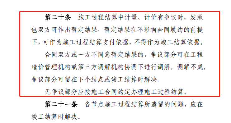 施工過程結(jié)算中計量、計價有爭議和無爭議兩種情形。對于有爭議部分,發(fā)承包雙方可作出暫定結(jié)果,并作為施工過程結(jié)算支付依據(jù),但不得作為竣工結(jié)算依據(jù),最終竣工結(jié)算按照雙方在調(diào)解后確定,或者在下個結(jié)點(diǎn)或者竣工結(jié)算時確定。