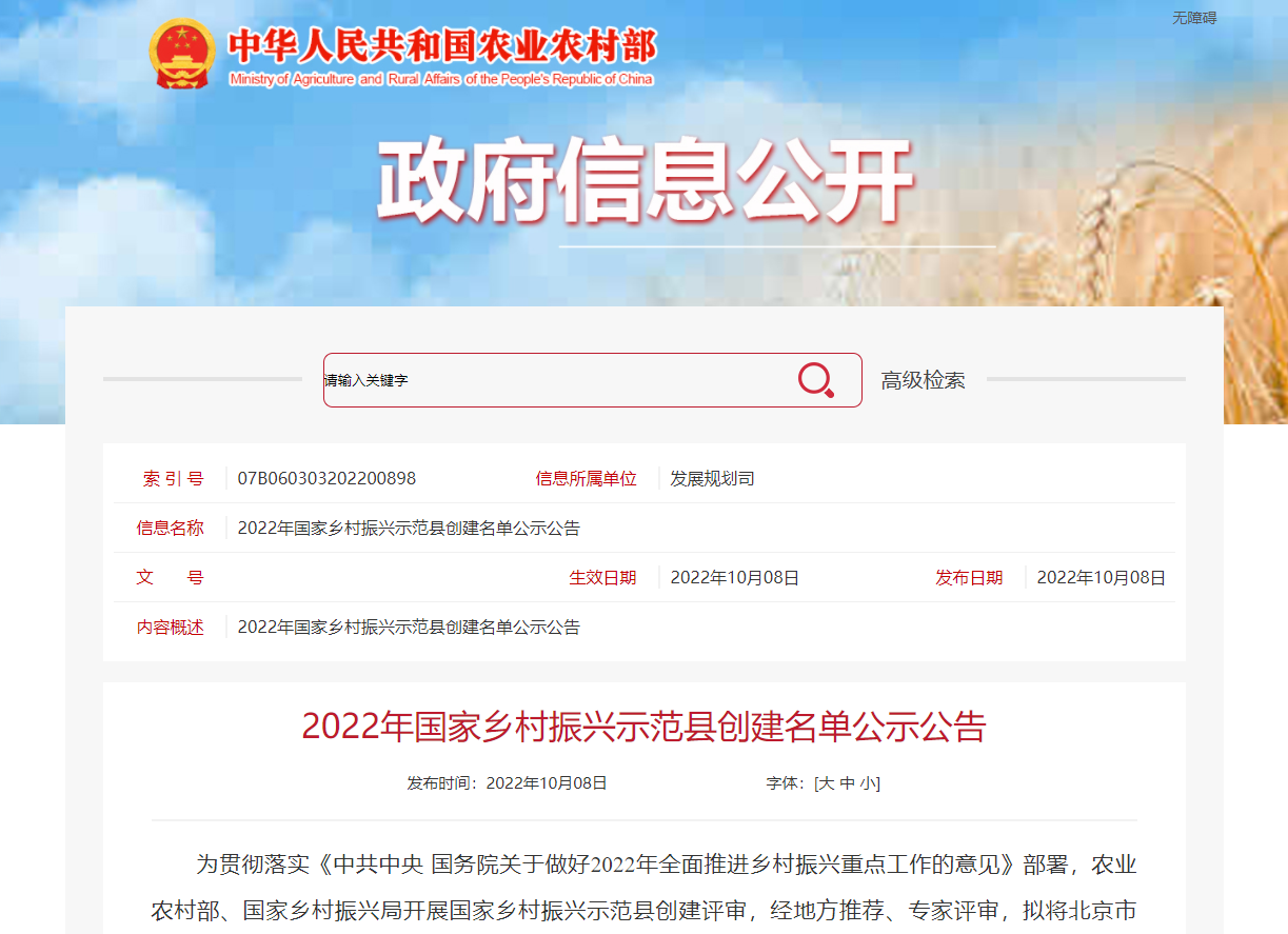 農(nóng)業(yè)農(nóng)村部、國家鄉(xiāng)村振興局開展國家鄉(xiāng)村振興示范縣創(chuàng)建評(píng)審,經(jīng)地方推薦、專家評(píng)審,擬將北京市大興區(qū)等100個(gè)申報(bào)單位納入2022年國家鄉(xiāng)村振興示范縣創(chuàng)建名單,湖北省4地入圍。