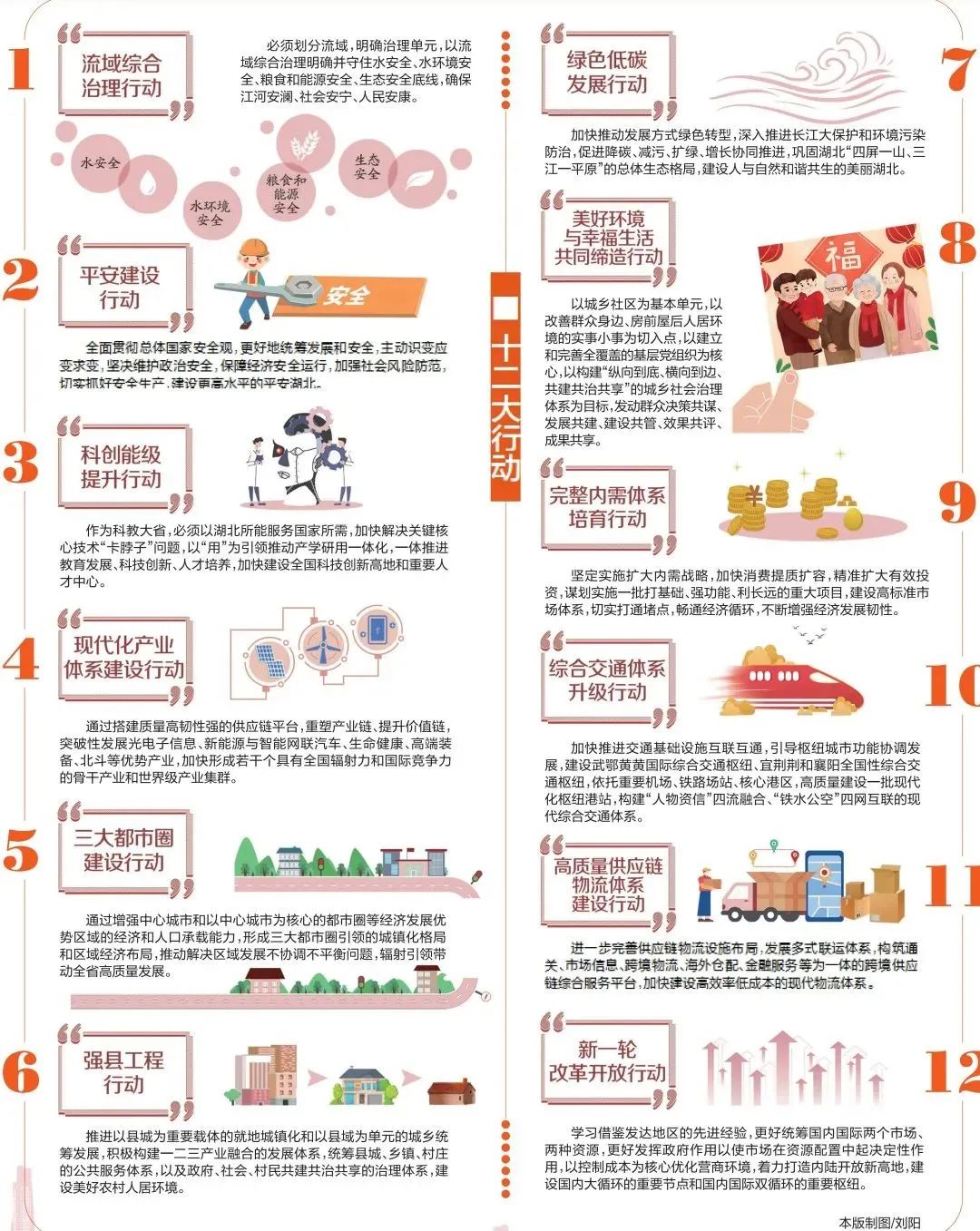 4月18日,湖北省政府新聞辦召開《關(guān)于加快建設(shè)全國構(gòu)建新發(fā)展格局先行區(qū)的實施意見》(以下簡稱《實施意見》)精神解讀系列新聞發(fā)布會第一場?!秾嵤┮庖姟饭卜秩蟛糠趾透郊5谝徊糠质强傮w要求,主要闡述文件起草的指導(dǎo)思想、總體思路、基本原則、主要目標(biāo);第二部分是主體,圍繞統(tǒng)籌發(fā)展和安全、統(tǒng)籌城鄉(xiāng)區(qū)域和資源環(huán)境、統(tǒng)籌國內(nèi)國際兩個市場兩種資源,部署“十二大行動”(具體內(nèi)容見下圖);第三部分從組織領(lǐng)導(dǎo)、完善配套政策、加強(qiáng)考核評估等方面強(qiáng)調(diào)了推進(jìn)實施的保障措施。附件為加快建設(shè)全國構(gòu)建新發(fā)展格局先行區(qū)的主要指標(biāo),設(shè)定了71項數(shù)據(jù)指標(biāo)。