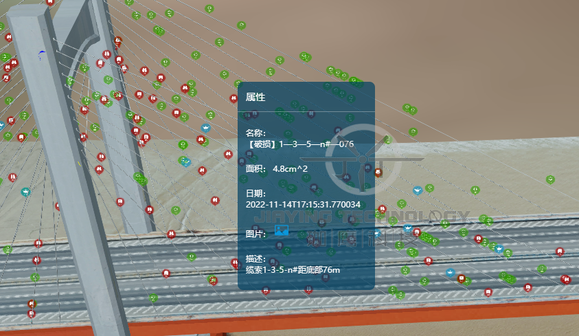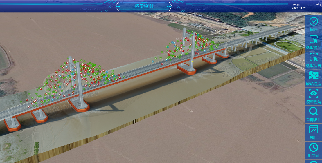 根據(jù)拍攝的高清圖像重建橋梁三維模型,并定量標(biāo)示各類缺陷的位置,并且搭建獨(dú)立的大數(shù)據(jù)云平臺,實現(xiàn)橋梁缺陷與病害的可視化,對橋梁問題進(jìn)行三維立體化復(fù)現(xiàn),為橋梁安全運(yùn)行提供數(shù)據(jù)支撐。