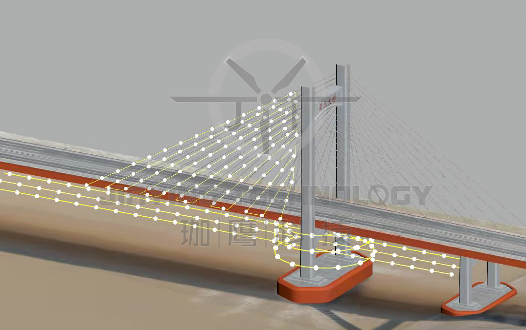 鰲江特大橋跨越鰲江口,主跨320米,主橋橋塔采用H型門式橋塔,索塔高為102.4米,相當(dāng)40層樓高,全橋共有96根斜拉索。就結(jié)構(gòu)特性而言,斜拉橋整體剛度遠(yuǎn)小于連續(xù)剛構(gòu)橋,因此通過智能檢測的手段收集病害信息至關(guān)重要。