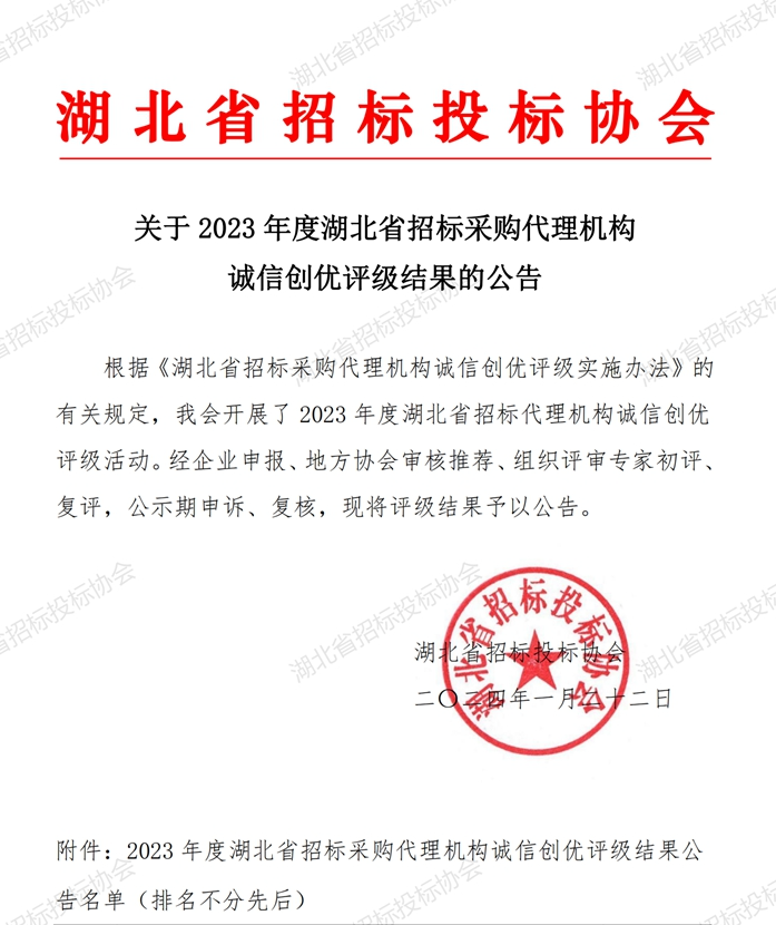 近日,鼎正憑借誠信的經(jīng)營理念、良好的企業(yè)信譽和優(yōu)質的服務質量,榮獲由湖北省招標投標協(xié)會認定的最高等級“招標采購代理機構信用評價AAA級信用企業(yè)”稱號。