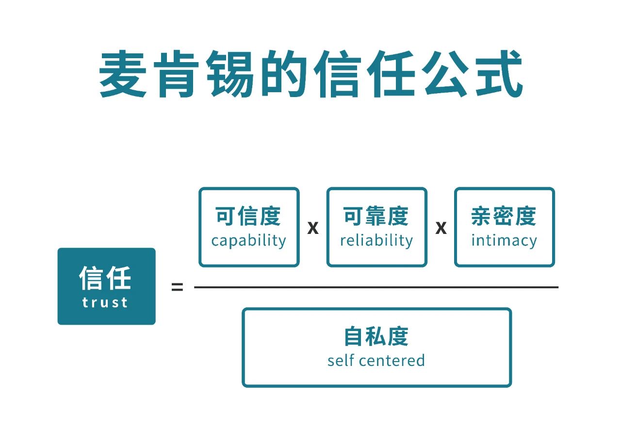 麥肯錫信任公式為我們對信任度進(jìn)行量化評估提供了指導(dǎo)框架。根據(jù)影響信任的4個因素,我們了解到,信任是藏在尋常日子里的點滴小事,也是在一件又一件的小事情中積累起來的一種相互關(guān)系。