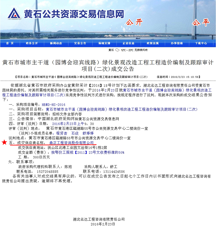 【經營成果】我司中標黃石市城市主干道(園博會迎賓線路)綠化景觀改造工程工程造價編制及跟蹤審計項目(二次)
