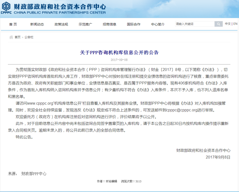 2017年9月8日,財(cái)政部PPP中心發(fā)布了《關(guān)于PPP咨詢(xún)機(jī)構(gòu)庫(kù)信息公開(kāi)的公告》,406家機(jī)構(gòu)符合《政府和社會(huì)資本合作(PPP)咨詢(xún)機(jī)構(gòu)庫(kù)管理暫行辦法》(財(cái)金【2017】8號(hào))入庫(kù)條件,鼎正公司成功入選財(cái)政部首批PPP咨詢(xún)機(jī)構(gòu)庫(kù)。