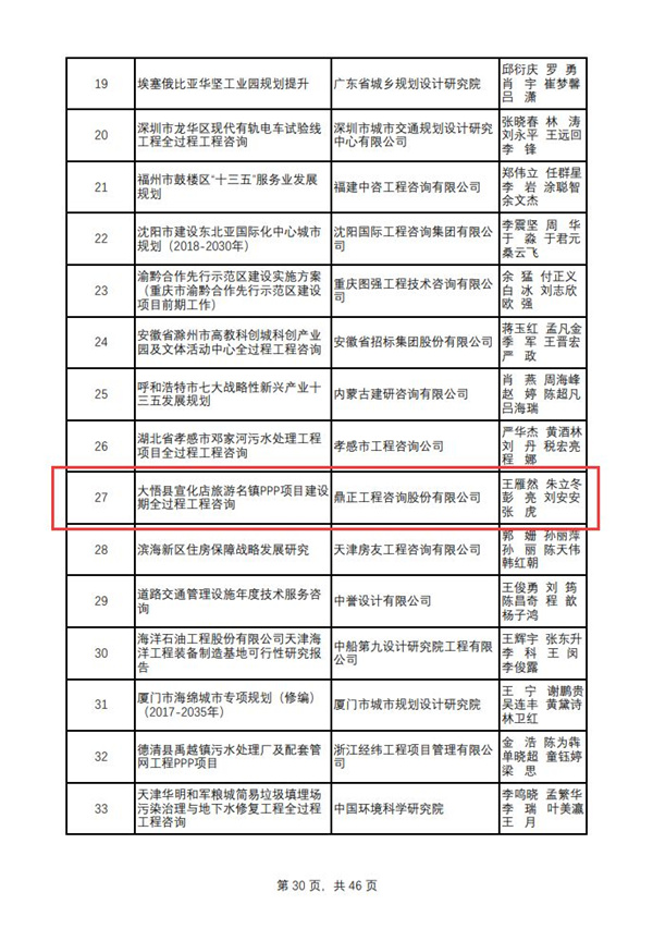 2019年12月27日,中國工程咨詢協會公布了“2018年度全國優秀工程咨詢成果獎”獲獎項目名單,由鼎正咨詢獨立編制完成的《大悟縣宣化店旅游名鎮建設PPP項目全過程工程咨詢報告》榮獲全國優秀工程咨詢成果三等獎!