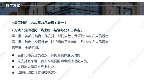 分批返崗、線上線下結(jié)合辦公,鼎正人的復(fù)工準(zhǔn)備工作正有序進(jìn)行。在疫情防控、復(fù)工復(fù)產(chǎn)兩手抓的同時(shí),鼎正咨詢將一如既往地為客戶提供專業(yè)的全過(guò)程工程咨詢服務(wù)。