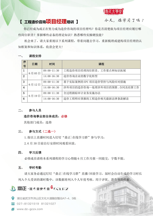 鼎正在6月份組織同事在線學習中價協舉辦的《工程造價咨詢企業項目經理網絡直播培訓》課程。