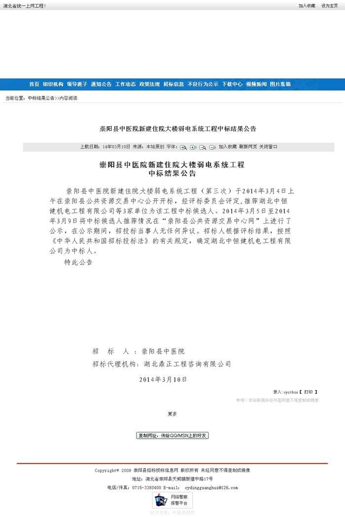 崇陽縣中醫(yī)院新建住院大樓弱電系統(tǒng)工程中標(biāo)結(jié)果公告